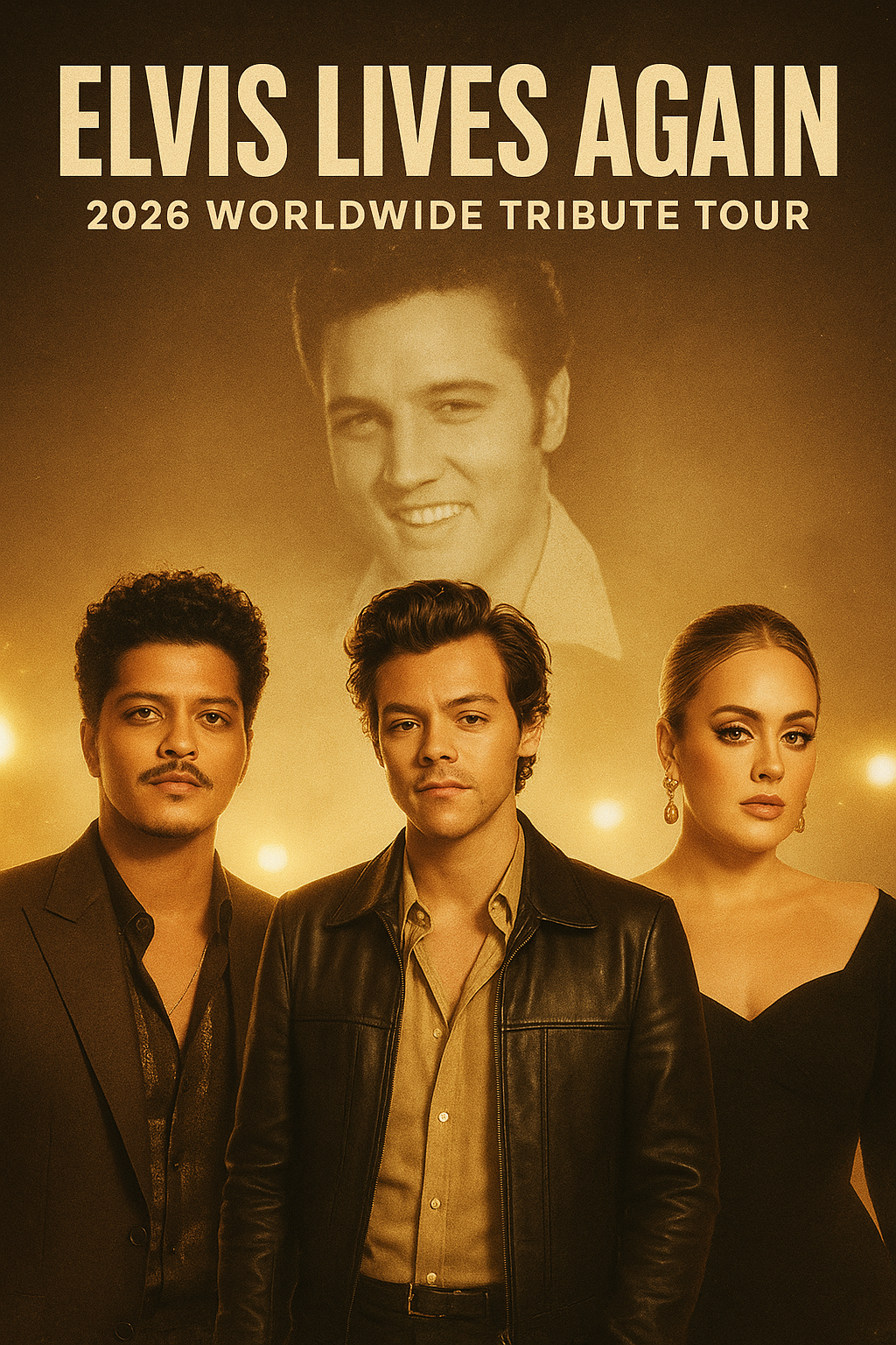 The world is preparing for a musical spectacle unlike anything seen in decades as global superstars unite to honor the everlasting legacy of Elvis Presley. Titled Elvis Lives Again, this monumental 2026 worldwide tribute tour brings together some of the biggest names in music—Bruno Mars, Harry Styles, Adele, and several surprise legends—to celebrate The King with a modern twist. Fans across continents are calling it the greatest tribute event of the century.