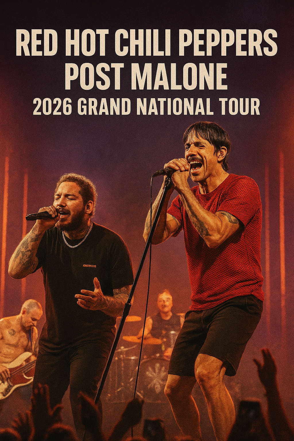 The announcement of the Red Hot Chili Peppers × Post Malone 2026 Grand National Tour has sent a shockwave of excitement through the global music community. Fans of both the legendary rock band and the genre-bending superstar are already calling it one of the most anticipated live events in years. The tour promises to merge two unique musical worlds — the funk-infused rock legacy of the Chili Peppers and the melodic, emotionally raw style of Post Malone — into one unforgettable live experience.