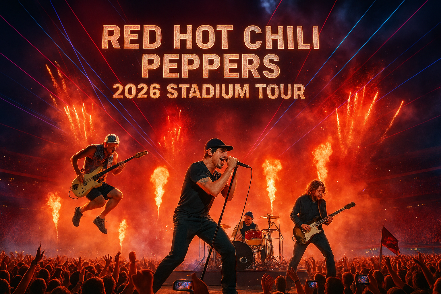 The Red Hot Chili Peppers have set the world ablaze once again with the announcement of their monumental 2026 Stadium Tour, a global journey that promises to redefine live rock experiences. With decades of history, unmatched charisma, and the kind of on-stage chemistry that can only come from years of friendship and fire, the band is ready to turn stadiums into temples of sound and spirit. The poster for the tour, drenched in the band’s signature heat and energy, captures the essence of what fans can expect—explosive performances, emotional moments, and a celebration of pure rock.